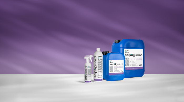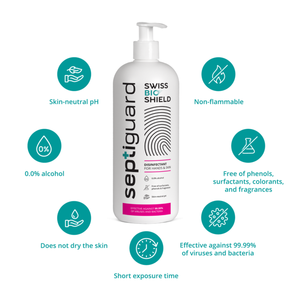SeptiGuard® surfaces was developed for disinfecting a wide range of materials and meets the highest hygiene requirements. Surfaces such as wood, treated metal, plastic, glass or other surfaces are reliably disinfected without damaging them.